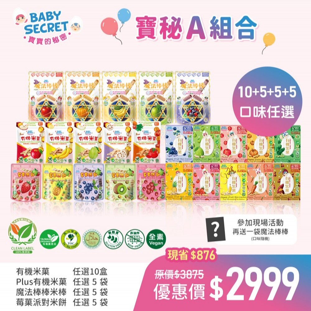 【BABY SECRET 寶寶的秘密 】有機米菓10盒 + PLUS有機米菓5袋 + 魔法棒棒M1益生菌有機米棒5袋 + 莓菓派對有機米餅5袋(口味任選)